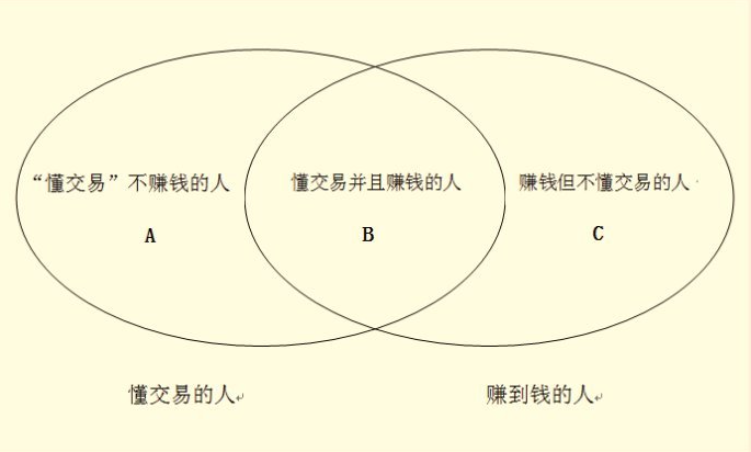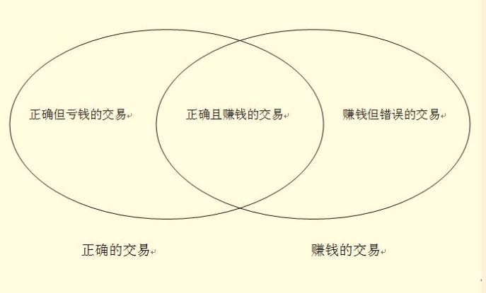 在金融交易的世界里,危害最大的莫过于“有奶就是娘”的思维方式。例如一个新手可能会认为:凡是赚钱的交易必定是正确的交易,亏钱则是错误的交易。或者,凡是赚到钱的人必定是“高手”,其看法和做法总是正确的,于是一心仰慕“高手”,想方设法地亲近、效法“高手”。但是,“高手”赚到钱是一回事,如何赚到的却未必经得起深究。虽然多数正确的交易都是赚钱的,并且多数赚钱的交易也都是正确的,但“正确的交易”和“赚钱的交易”并不等价。有些交易虽然赚钱了,但方法却是错误的,因而不足为训;有些交易虽然亏钱了,但依然是正确的,因为遵循的是正确的系统信号与交易规则。虽然从结果上看是亏钱的,但当时如果不那么做反而是错误的。图1-1和图1-2可以帮助大家理解“正确的交易”与“赚钱的交易”,以及“懂交易的人”与“赚到钱的人”之区别与联系。在图1-1中,左边的集合是“正确的交易”,右边的集合是“赚钱的交易”,二者存在交集,但并不重合。在图1-2中,左边的集合是“懂交易的人”,右边的集合是“赚到钱的人”,二者存在交集,但也不重合。市场上有一些真正懂得交易并且能够持续盈利的人,虽是极少数,但他们客观存在。还有些人,虽然“懂交易”却还不能盈利——尽管精研交易之道多年,但在技术系统、资金管理或自我管理方面存在盲区,眼下依然处于亏损状态;但只要有明白人指点并且勇于虚心改进,就有扭亏为盈的希望。另有一些福报大、偏财旺的人,非惟投机,干任何一行都是钱来毫不费工夫。这类人社会影响大却没有任何学习价值。除极个别有自知之明的以外,大部分人误以为自己懂交易。但实际上除非赔光一切,否则永远不可能真正懂得。
